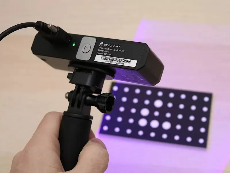 Revopoint Mini включает в себя пластину, которую можно использовать для калибровки камеры на сканере. Процесс калибровки включает в себя перемещение сканера в различные положения над пластиной при сохранении заданного расстояния и занимает около 10 минут. Revopoint рекомендует калибровать сканер только если поверхность 3D-модели выглядит очень шероховатой или зернистой.