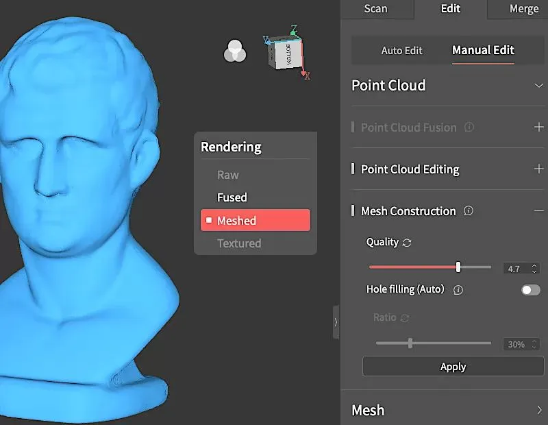 Revopoint Mini обладает режимом высокой точности, создающим плотное облако точек, которое можно легко совместить с другими для объединения сканов одного объекта между собой. Одной из особенностей Revo Scan 5 является возможность выполнять несколько сканирований одной и той же модели и выравнивать их вместе, чтобы создать сетку. Использование данного рабочего процесса привело к сканированию прилагаемой демонстрационной модели без отверстий, а также к гладкой и детализированной поверхности.
