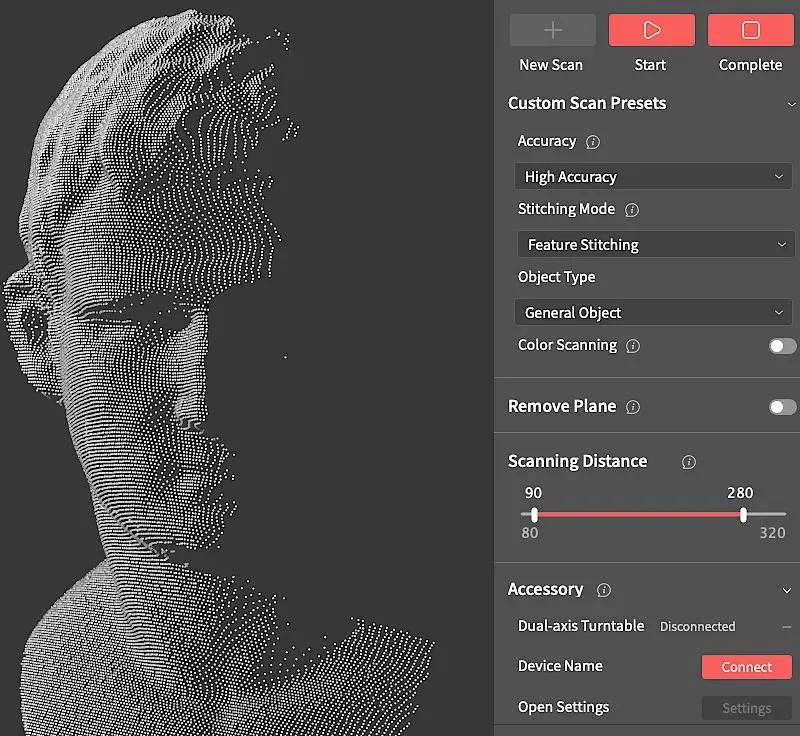 Revopoint делает основной акцент Mini именно в сканировании небольших моделей, для чего идеально подходит миниатюрный поворотный стол. Кроме того, черный брезент может блокировать загруженный фон, чтобы сканер не мог захватывать элементы в фоновом режиме во время сканирования.