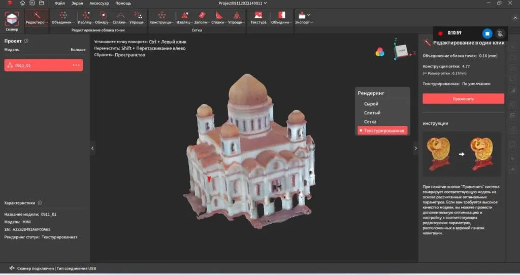 - Выходной формат: STL, PLY, OBJ (с текстурой)