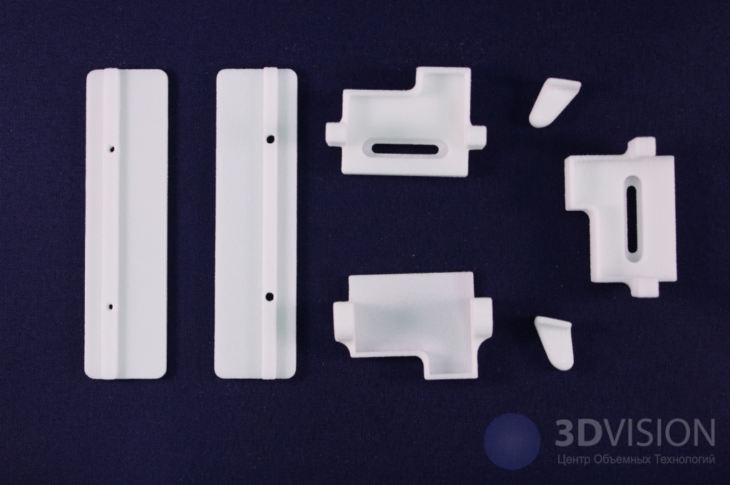 Объект формируется путем выборочного спекания лазером мелкодисперсного порошкового материала (пластик). Материал наносится на платформу тонким слоем, после чего лазер формирует на поверхности геометрию изготавливаемого изделия. Затем платформа опускается, на нее вновь наносится материал и процесс повторяется. Данная технология не нуждается в поддержках при печати пластиком навесных элементов объекта, за счет заполнения пустот не спечённым порошком. Процесс печати происходит в камере где поддерживается бескислородная среда.