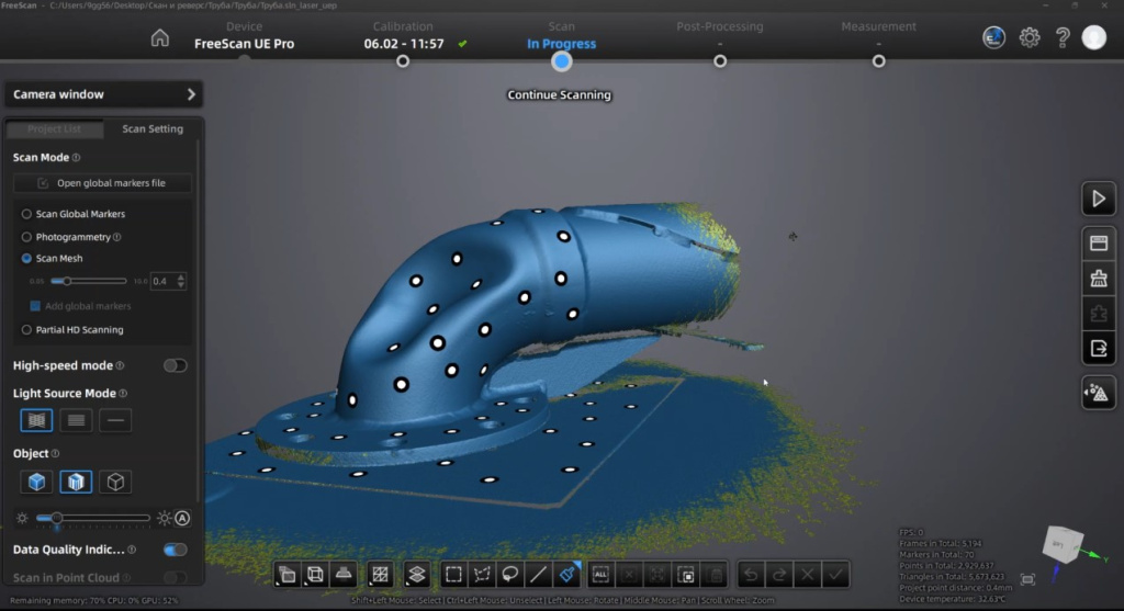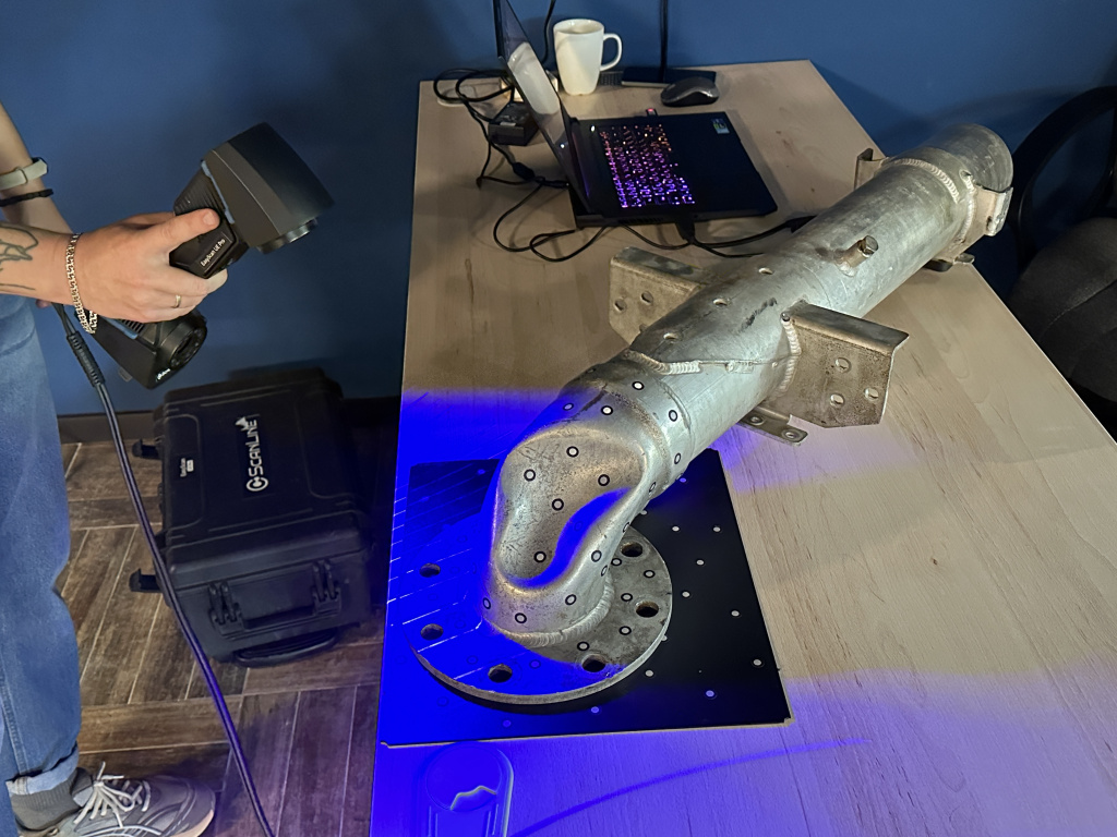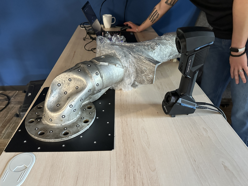 Первым шагом в процессе стало создание цифровой модели деформированной трубы. Для этого был использован профессиональный 3D-сканер ScanLine EasyScan UE PRO, который отличается высокой точностью (до 0,014 мм) и скоростью работы (1 850 000 точек/с).