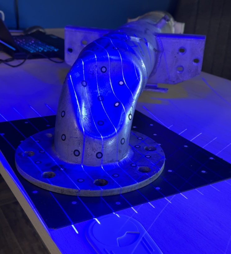Сканирование: ScanLine EasyScan UE PRO использует 26 лазерных линий для создания точной 3D-модели. Сканер последовательно фиксировал данные с разных ракурсов, чтобы покрыть всю поверхность трубы, включая участок с деформацией. Процесс занял всего несколько минут благодаря высокой скорости работы устройства.