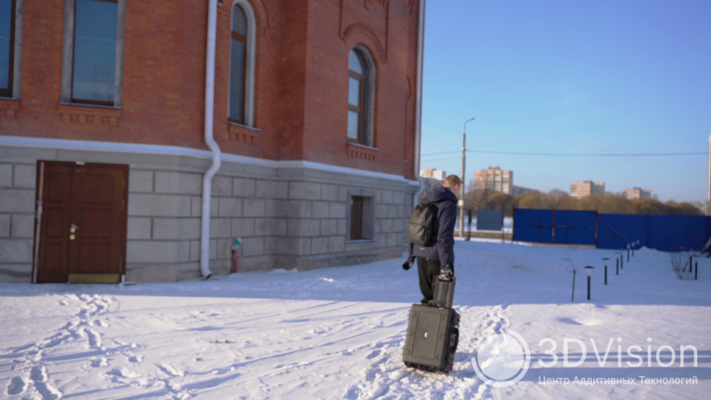 Транспортировка устройства не составила никакого труда, так как кейс сканера обладает высокой прочностью и удобством для перевозки (снабжен двумя колесами в нижней части кейса, длинной выдвижной ручкой и короткой ручкой для транспортировки на весу). Таким образом, все необходимое оборудование для работы с легкостью можно донести в одиночку.