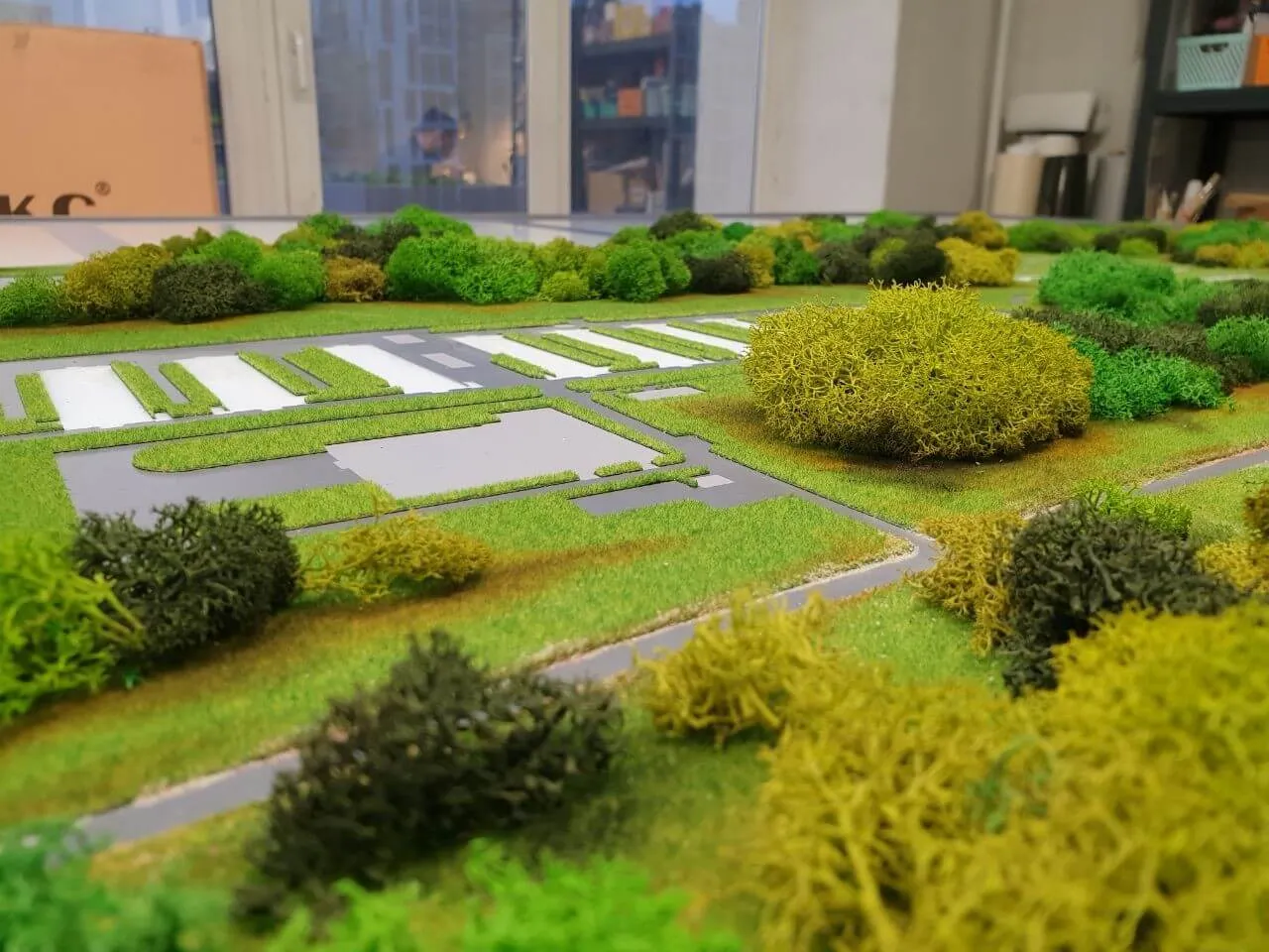 Для создания данного макета использовались следующие материалы: полистирол 0.5-5мм, пвх 3-5мм, пэт и оргстекло 0,5-5мм, самоклеящаяся виниловая пленка и материалы для озеленения макета (газоны, стабилизированный мох), акриловые аэрозольные краски и грунты.