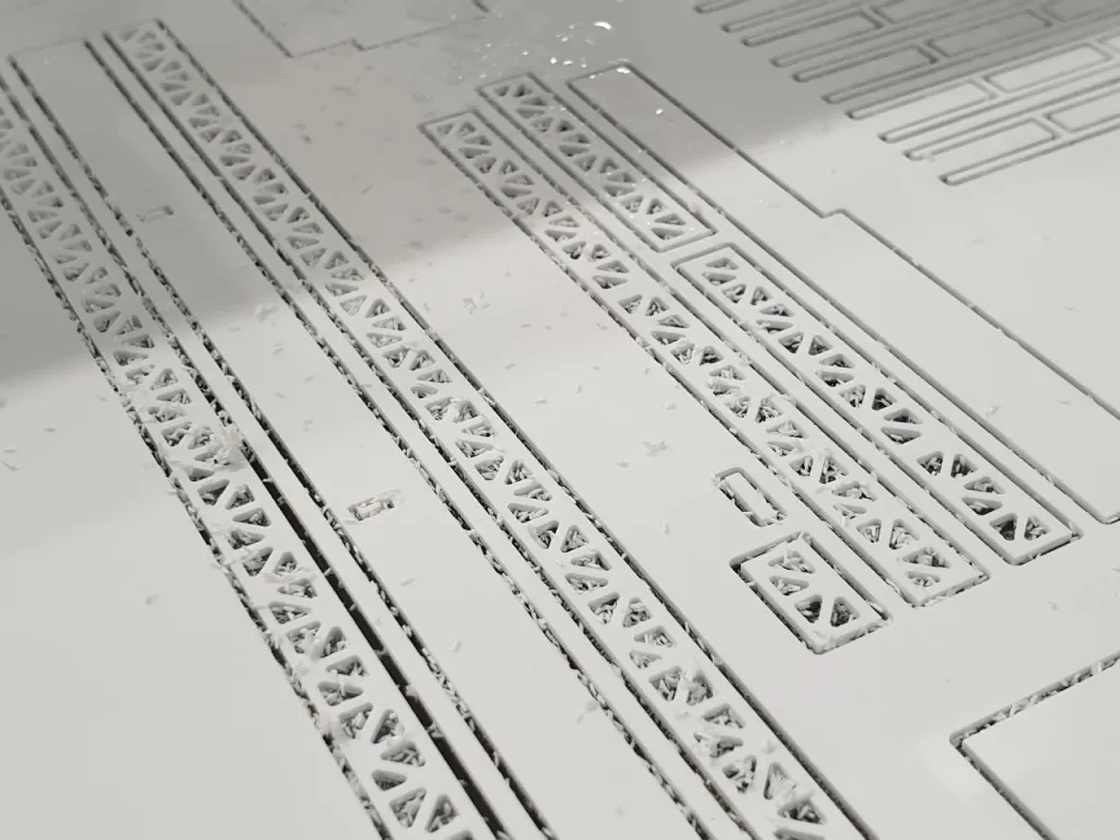 С помощью лазерного, фрезерного и плоттерного станков вырезаются детали фасадов, кровли, остекления и малых архитектурных форм (МАФ).
