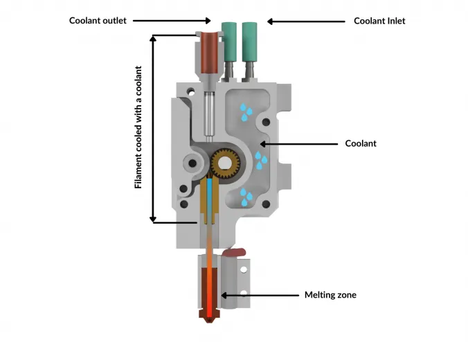 По сути, экструдер, созданный специалистами Omni3D, функционирует и одновременно поглощает тепловую энергию своим корпусом, а затем передает ее через охлаждающую жидкость в радиатор, который сбрасывает излишки тепла в окружающую среду. Создав систему из алюминия и титана и избежав необходимости установки специального теплоотвода, производитель сделал конструкцию более легкой, компактной и производительной.