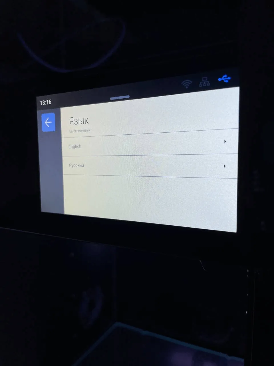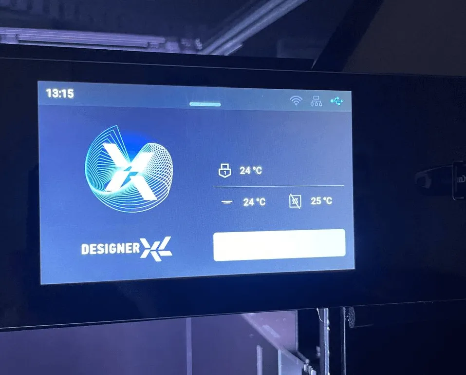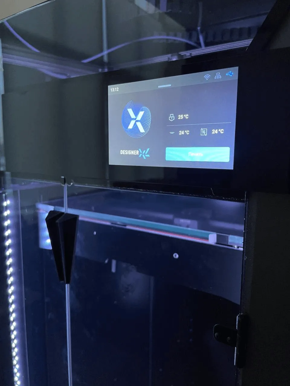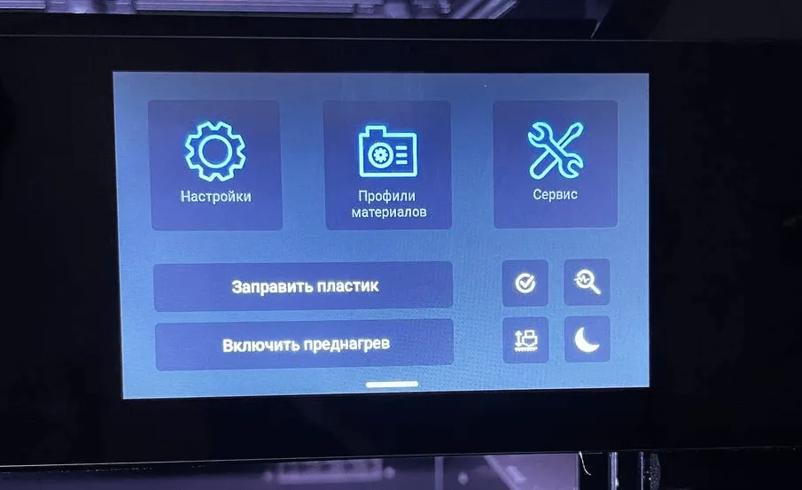 Экран отображает температуру сопла, стола и термокамеры, а также индикаторы подключения по Wi-Fi, локальной сети и USB.