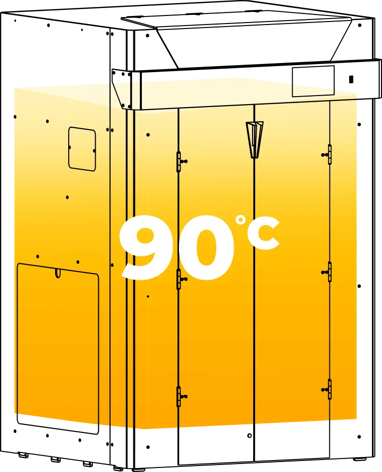 Благодаря активной подогреваемой камере, возможен разогрев до целевого значения перед началом работы и поддержка температуры до завершения печати. Это достигается за счёт датчиков температуры, которые приближены к зоне печати, чтобы точнее отслеживать состояние системы.