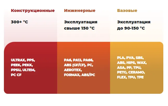 Какие же материалы печати поддерживает устройство? Для ответа на этот вопрос возьмём за основу классификацию PICASO 3D: