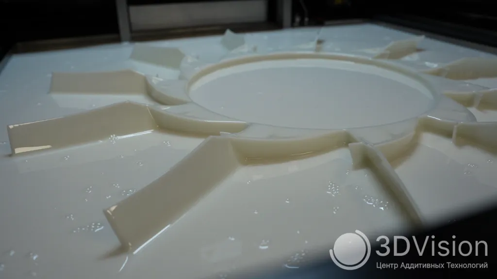 После проверки и подготовки модели наши специалисты отправляют файл на печать. Затем принтер создаёт изделие из фотополимера; цвет, физико-механические свойства и прочие характеристики которого наши менеджеры согласовывают с заказчиком заранее. Далее следует процесс постобработки (удаление поддерживающих конструкций и промывка модели в спирте).