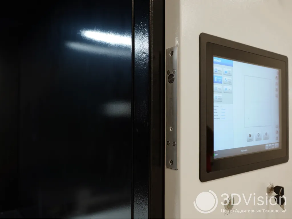 Справа от дверцы 3D-принтера находится электронный замок. Если его активировать, то во время работы принтера дверца автоматически блокируется. Разблокировка происходит после завершения процесса печати. Эта функция помогает избежать ошибок, связанных с человеческим фактором, и случайных помех, которые могут негативно повлиять на качество 3D-печати.