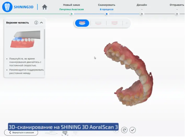 На сегодняшний день в прогрессивных клиниках высокого уровня пациентам предлагают комфортную процедуру внутриротового 3D-сканирования. Сканирование выполняется за один визит, занимает около 4-5 минут и позволяет сразу же смоделировать цветное, высокодетализированное трехмерное изображение зубных рядов и окружающих мягких тканей полости рта. Для проведения вышеописанной манипуляции применяется специальной прибор - интраоральный сканер.
