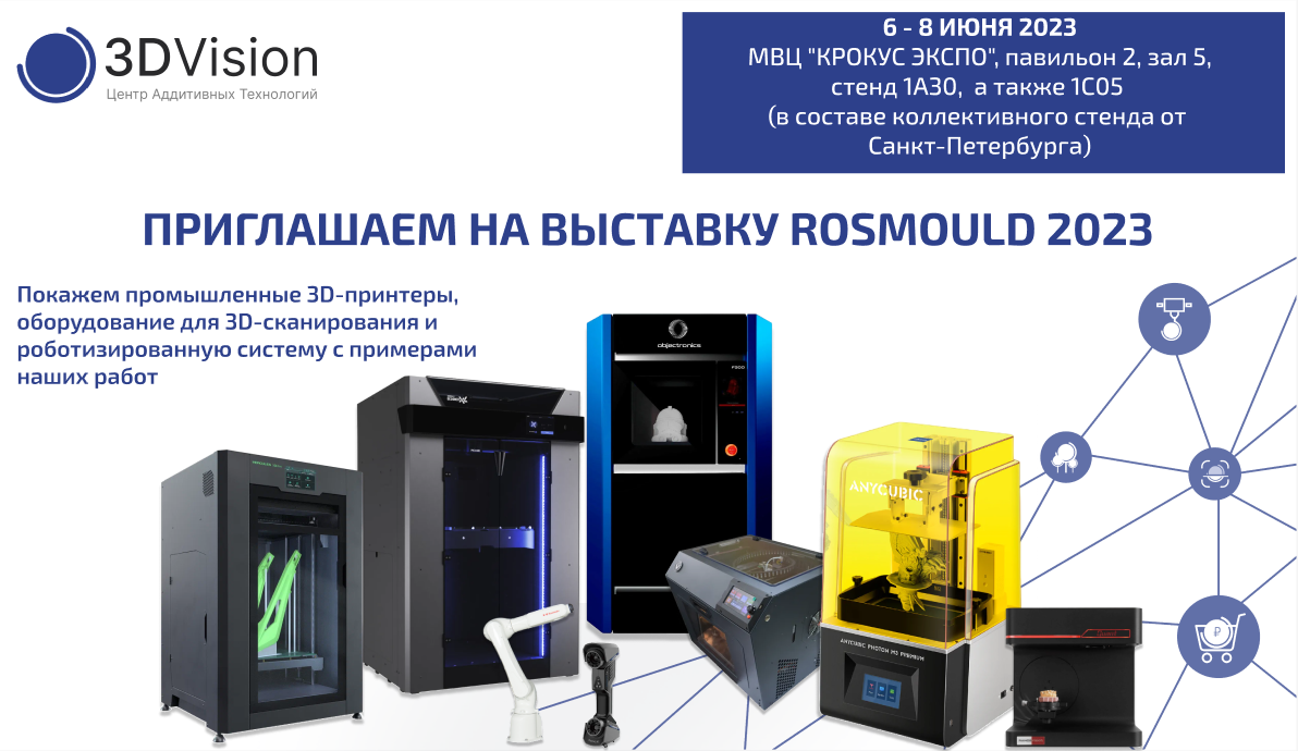 Компания 3DVision готовится к участию в выставке Rosmould 2023, которая пройдет с 6 по 8 июня 2023 года в МВЦ "КРОКУС ЭКСПО", павильон 2.
