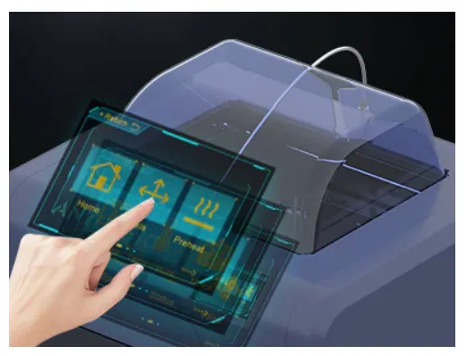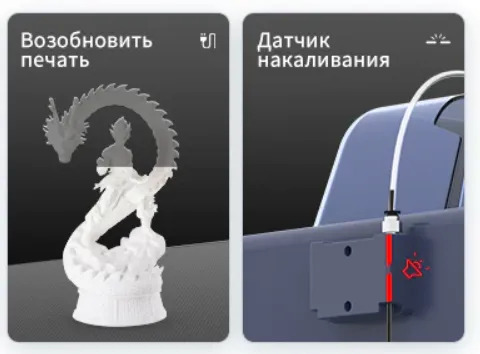 4. Функция возобновления 3D печати после отключения электроэнергии, опция автоматической остановки принтера при заканчивании пластиковой нити или ее обрыве.