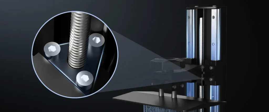 Двойные линейные направляющие в сочитании с распорной гайкой из полиоксиметилена и конструкции, поглощающей вибрации, ось Z в Photon Mono M5 работает с большей стабильностью и точностью.