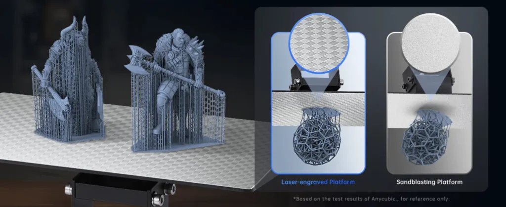 Модель принтера Anycubic Photon Mono M5 использует платформа с лазерной гравировкой и шахматным рисунком, обеспечивающая большую плоскостность и лучшую адгезию модели. Это не только предотвращает падение или деформацию модели, но и повышает вероятность успешной печати.