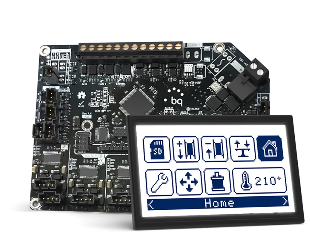 BQ Zum CNC - это новая плата, которая была специально разработана для Witbox 2 командой BQ. Она способна обеспечить 3D-принтеру плавное движение всех моторов и гарантирует лучший теплоотвод, по сравнению с прежними решениями. Все соединения на плате надежно электронные потенциометры избавляют нас от необходимости ручной настройки. Графический ЖК-дисплей с высоким разрешением располагает к себе интуитивно понятным интерфейсом. Он, наряду с электроникой, управляющей дисплеем, также были разработаны внутри компании.