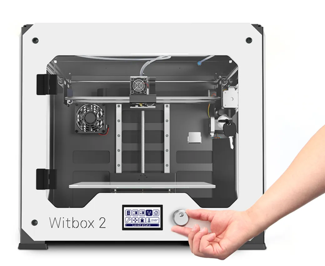 Witbox 2 имеет новую систему автокалибровки, избавляющую вас от необходимости вручную регулировать платформу. При включении принтер сам обнаружит отклонения в калибровке стола с помощью индуктивного датчика. Затем он соразмерно отрегулирует движение моторов, давая возможность получить идеальный результат даже на наклонной поверхности.