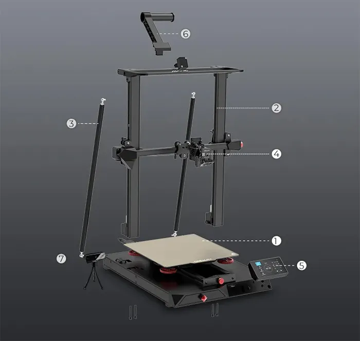 Рама принтера выполнена из металла и имеет специальные диагональные упоры, которые повышают ее жесткость. Она состоит всего из 7 модульных частей, что позволяет собрать ее всего за 10 минут.