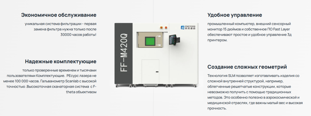 FF-420Q – это современный промышленный 3D-принтер, разработанный для высокоточной печати металлическими материалами. С большой рабочей областью (420×380×300 мм) и передовыми технологиями, он идеально подходит для задач, требующих высокой производительности, точности и надежности. Этот принтер предназначен для использования в таких отраслях, как аэрокосмическая промышленность, автомобилестроение, медицина, энергетика и другие.