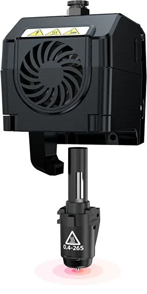 Экструдер был обновлен, что значительно расширило возможности принтера. Теперь его максимальная температура составляет 265 градусов, что позволяет работать с широким спектром материалов, таких как PLA, ABS, PETG, PLA-CF, PETG-CF, PC и другие. За всего 60 секунд этот экструдер разогревается до 200 градусов. Благодаря удачной конструкции, его легко снимать и обслуживать. Максимальная скорость печати увеличилась до 150 мм/с.