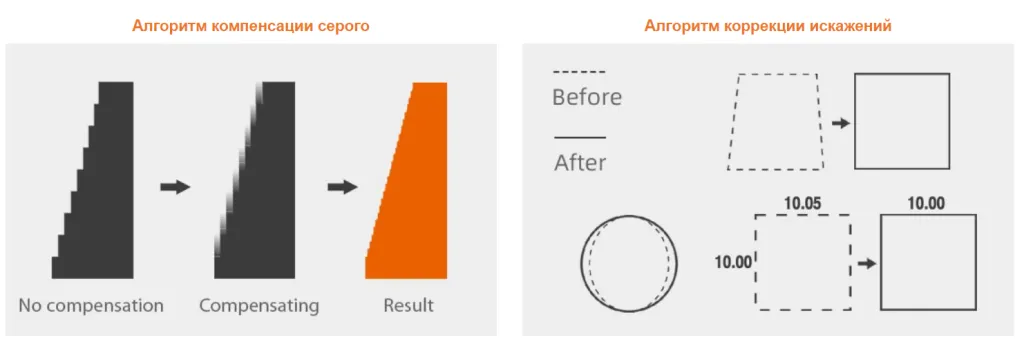11. Алгоритм компенсации серого цвета и коррекции обеспечивает более гладкую поверхность и более высокую точность размеров печатаемых объектов и деталей.