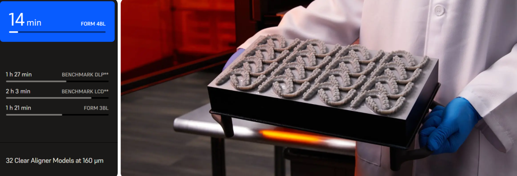 Рабочая зона принтера значительно увеличена по сравнению с базовой моделью Form 4 и составляет впечатляющие 353×196×350 мм. Это позволяет печатать 32 плоские зубные модели одновременно и создавать до 75 вертикальных зубных моделей в одной печати.