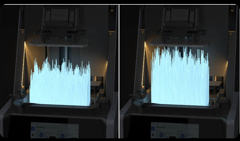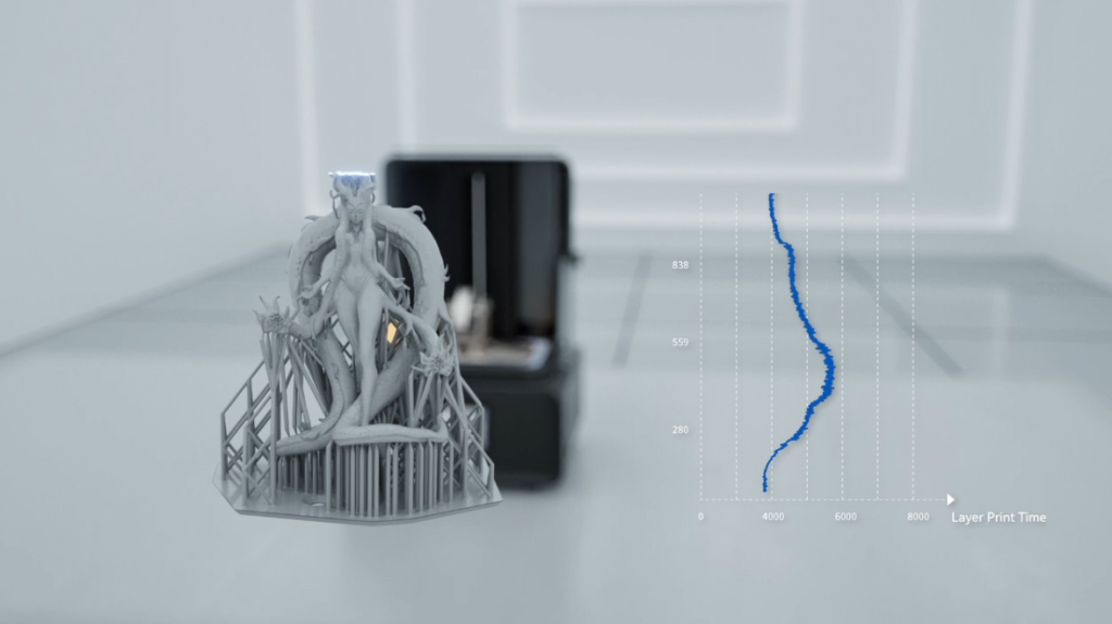 Увеличенная скорость печати: средняя скорость слоя составляет 4,5 секунды на слой по сравнению со средним значением 12 секунд на слой для предыдущей модели при использовании смолы PAWW10 в качестве эталона. Принтер интегрировал новый Dynamic Motion Algorithm 3.0, который использует семисегментную логику управления движением для каждого слоя с данными в реальном времени от датчиков силы, измеряющих с частотой 80 раз в секунду.