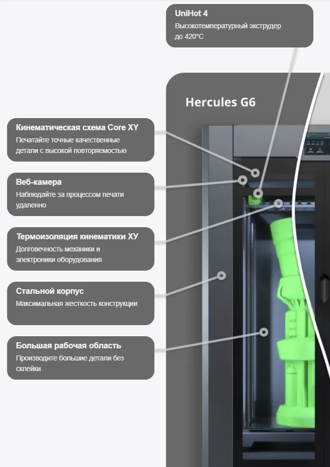IMPRINTA Hercules G6 оснащается высокотемпературным экструдером собственной разработки. Он позволяет эффективно работать с широким спектром материалов, включая технические, гибкие и высокотемпературные пластики.