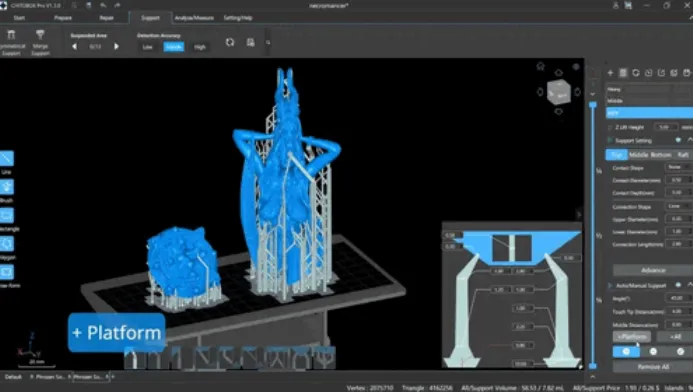 Автоматические опоры для сохранения более гладких поверхностей. CHITUBOX Pro распознает подвешенные области и разумно добавляет опоры. Редактируемые опоры с настраиваемыми параметрами можно легко удалить, чтобы сохранить детали.