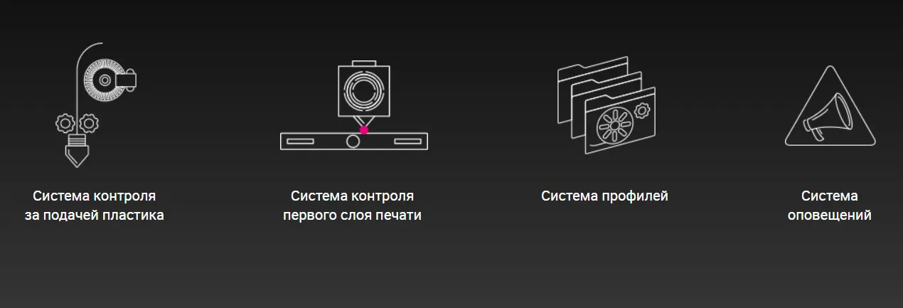 | Материалы | ABS, FORMAX, PLA, ULTRAN 630, ULTRAN 6130, ASA, ABS/PC, PET, PC, FRICTION, CAST, RELAX, ETERNAL, FLEX, RUBBER, SEALANT, PETG, AEROTEX, CERAMO, WAX, SBS, SBS PRO, PROTOTYPER SOFT, PRO-FLEX, TOTAL PRO, NYLON, PVA, HIPS и другие. |
