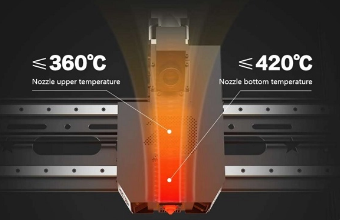 Экструдер нового поколения с сегментированными зонами нагрева поддерживает установку сопел диаметром от 0,4 до 2 мм и способен работать с гранулами размером 2–5 мм. Материал подаётся из вместительного бункера объёмом 3 литра, что обеспечивает стабильную подачу и высокую скорость наплавления. Благодаря нагреву до 420 °C, экструдер совместим с широким спектром термопластичных материалов.