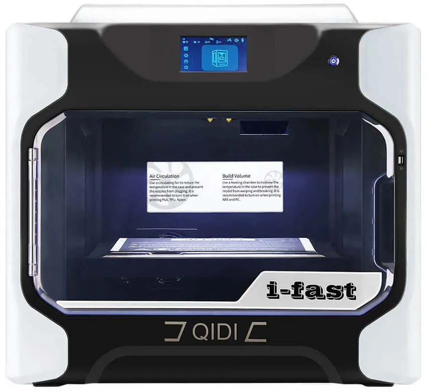 3D-принтер Qidi Tech i-Fast – профессиональное оборудование для трехмерной FDM-печати от китайского производителя, рассчитанное на широкий спектр применений. Устройство оснащено закрытой рабочей камерой с отличной терморегуляцией и двойным экструдером, позволяющим печатать двумя цветами или изготавливать растворимые поддержки из другого материала (PVA, HIPS). Принтер также выпускается в модификации с одним экструдером для печати специальными пластиками (высокотемпературными или абразивными). Использование одинарного рубинового сопла уменьшает утечку и прилипание материала, повышая качество печати. Увеличенная область построения позволяет изготавливать крупные объекты или сразу несколько небольших моделей.
