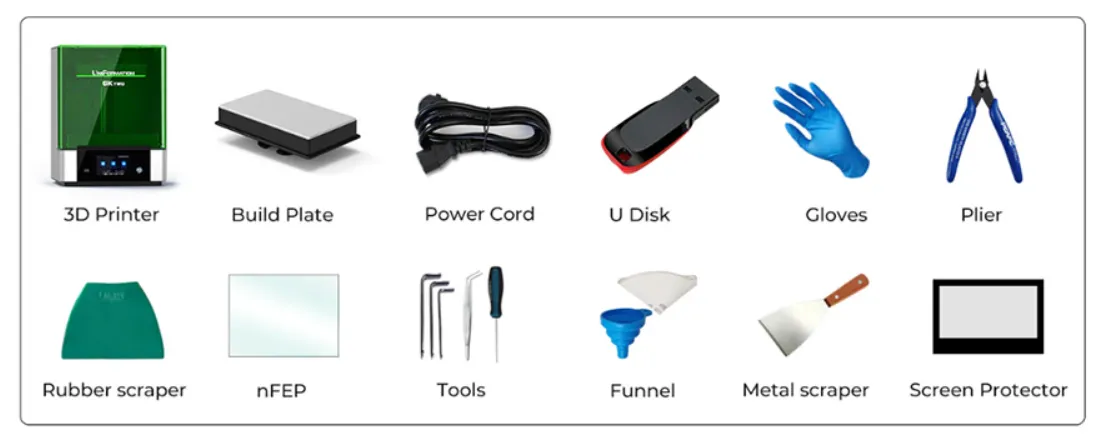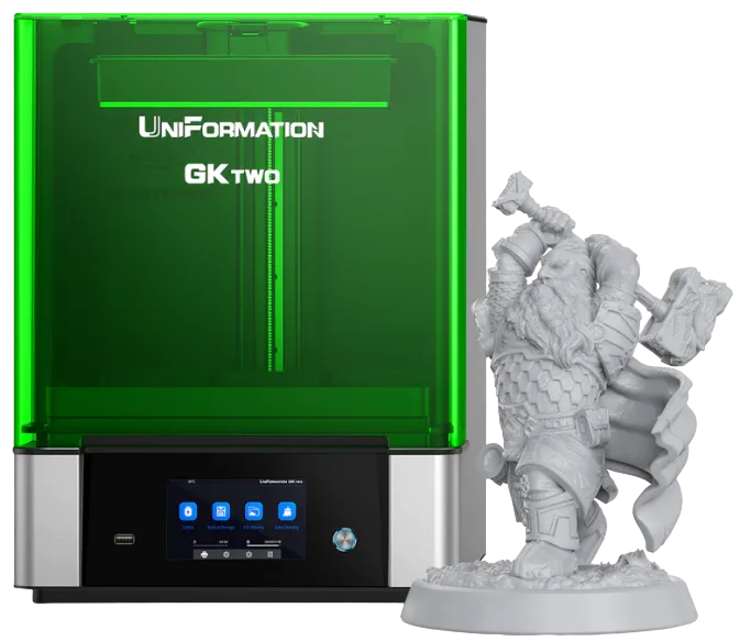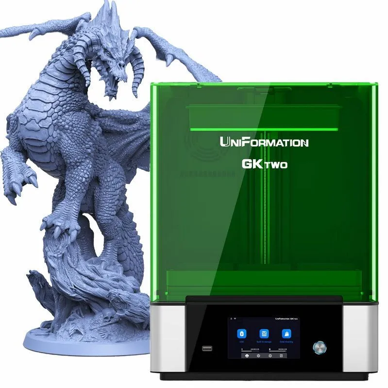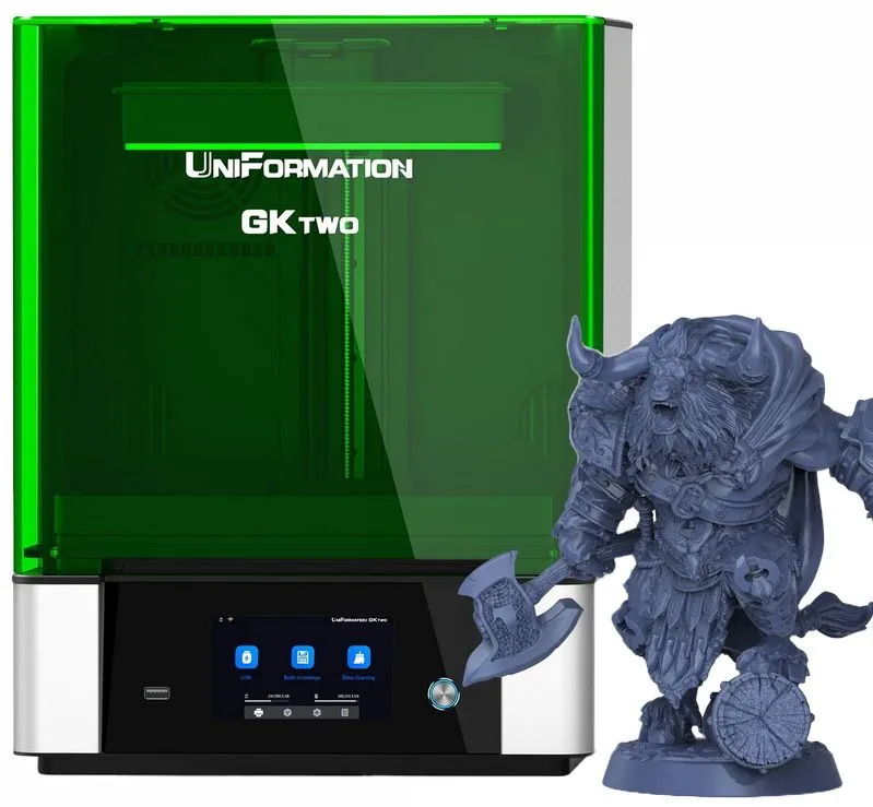 Новинка в мире широкоформатных LCD-принтеров – 3D принтер UniFormation GKtwo 10.3'' 8K. Это устройство обладает сверхвысоким разрешением 8K и огромной областью построения. Разрешение монохромной матрицы с диагональю 10.3 дюйма составляет 7680x4320 пикселей, а точность по оси XY – 29,6 микрон. 3D-принтер UniFormation GKtwo обладает большой область. построения: 228х128х245 мм. Модель GKtwo использует матричный параллельный источник света, что позволяет добиться впечатляющей детализации у деталей. Кроме того, улучшенная защитная пленка на ЖК-матрице помогает защитить её от любой случайной утечки фотополимерной смолы.