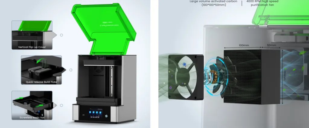 3D принтер UniFormation GKtwo 10.3'' 8K обладает быстроразъемной конструкцией, а также мощным воздушным фильтром, что делает процесс печати еще более удобным и эффективным.