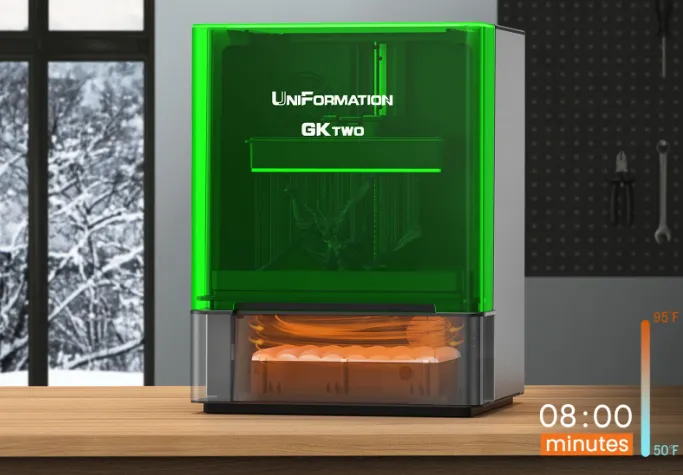 3D принтер UniFormation GKtwo 10.3'' 8K имеет характерную особенность- он использует керамический нагреватель PTC, который способен поднимать температуру в рабочей зоне до 26 градусов по Цельсию в зависимости от температуры окружающей среды.