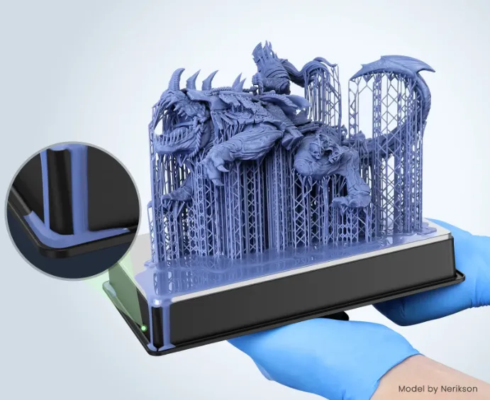 Для удобства печати и очистки предусмотрена уникальная система крепления, которая не требует использования винтов как для ванны, так и для рабочей платформы. Благодаря встроенному широкому лотку для ванны, количество отходов значительно сокращается, что делает процесс печати и очистки гораздо более удобным и простым.
