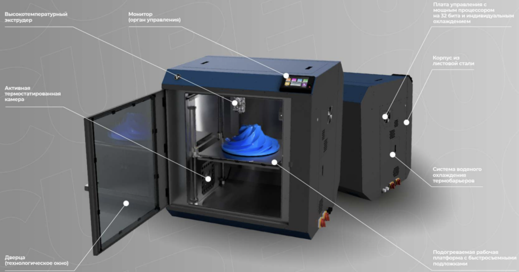 Для точной печати прочных и массивных деталей предусмотрена камера с прогревом, температура которой близка к температуре стеклования полимера. Специальный высокотемпературный рабочий стол с легкосъемными подложками.