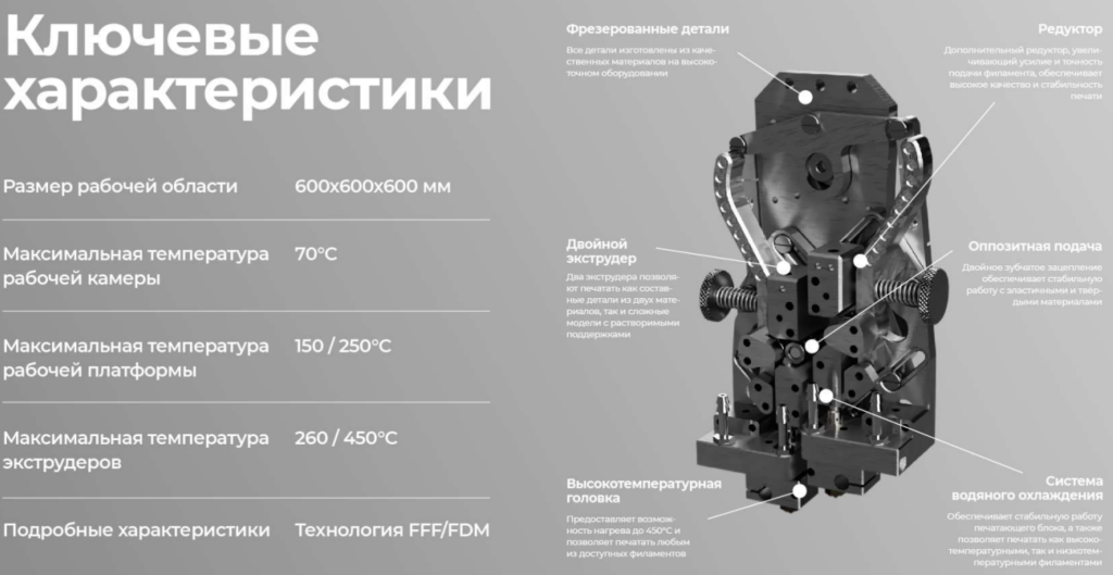 | Материалы | ABS, PLA, HIPS, PVA, PETG, WAX3D, ASA, SBS, TPU, PP, PC, PA6, PA12, PA66, POK, PSU, PEKK, ULTEM, PEEK |