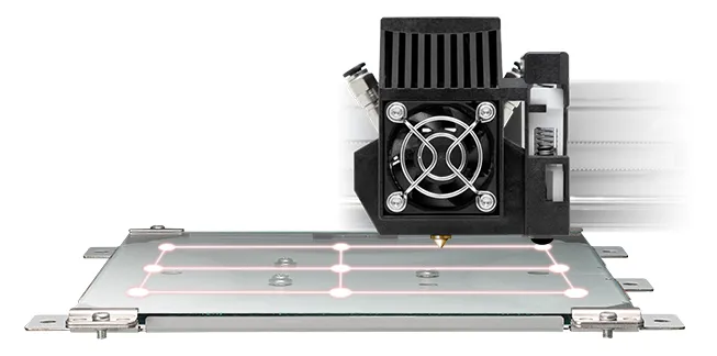 Система автоматической калибровки. Устройство использует интуитивно понятную 9-точечную калибровку системы обнаружения, которая точно определяет расстояние между экструдером и платформой печати. Благодаря данной технологии гарантируется качественная и точная печать.