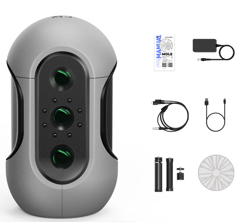 3D сканер 3DMakerpro Mole доступен в нескольких комплектациях для решения разных задач пользователей. В Стандартную комплектацию входит сам сканер и комплект кабелей для подключения. Премиальную комплектацию производитель дополняет поворотным столом и штативом для автоматического сканирования. В Элитную комплектацию помимо аксессуаров из Премиальной входит набор аксессуаров для сканирования текстур.