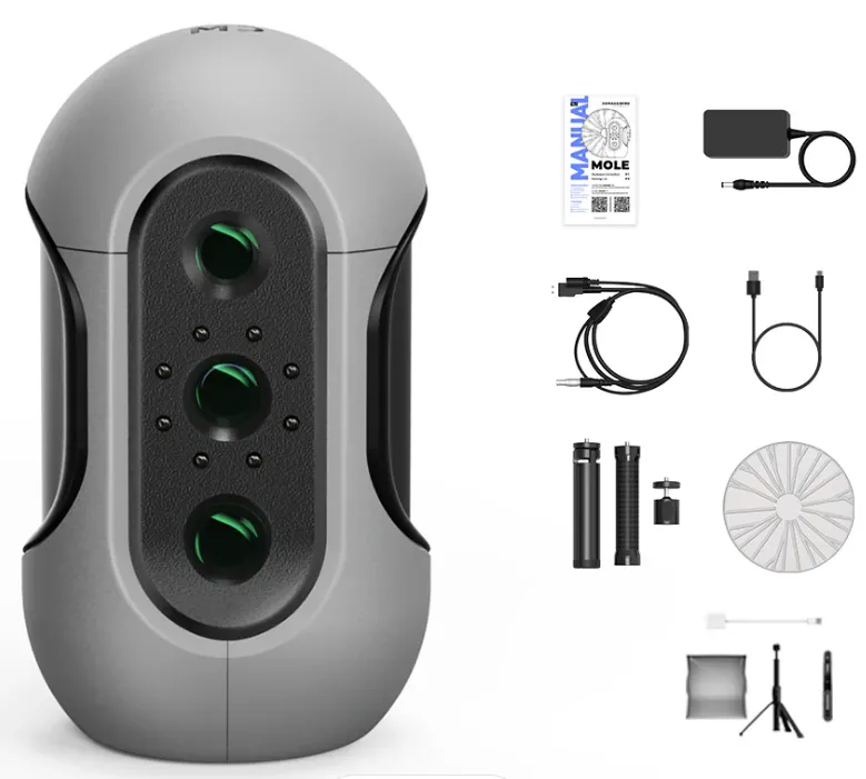 Профессиональное портативное оборудование для 3D сканирования - это 3D сканер 3DMakerpro Mole. Он обладает высокой точностью сканирования и способен захватывать даже самые мелкие элементы. Идеально подходит для работы с объектами среднего размера. Область сканирования 3D сканера Mole составляет 200х100 мм, что в сочетании с его скоростью сканирования до 10 кадров в секунду обеспечивает высокую производительность. Файлы данных могут быть экспортированы в несколько популярных форматов, таких как STL/OBJ/PLY.