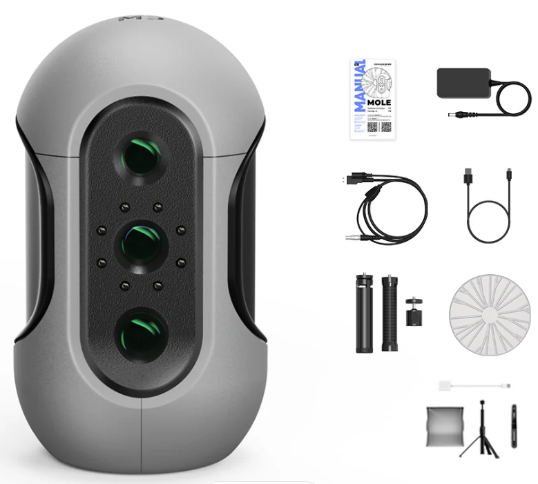 3D сканер 3DMakerpro Mole доступен в нескольких комплектациях для решения разных задач пользователей. В Стандартную комплектацию входит сам сканер и комплект кабелей для подключения. Премиальную комплектацию производитель дополняет поворотным столом и штативом для автоматического сканирования. В Элитную комплектацию помимо аксессуаров из Премиальной входит набор аксессуаров для сканирования текстур.