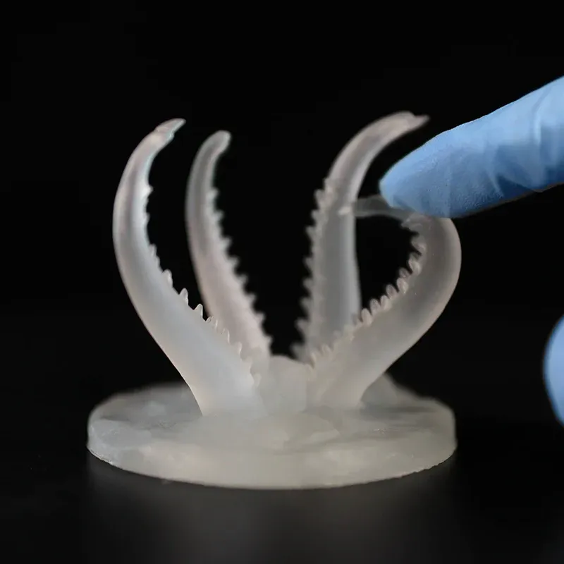 Фотополимер Resione F39T Flex — прозрачная гибкая смола и высокой прочностью на разрыв. Этот материал обладает уникальными свойствами, которые делают его идеальным для использования в различных областях. С его помощью можно создавать разнообразные изделия, начиная от игрушек и обуви, заканчивая шинами и прототипами. При повышенных температурах он становится мягким, но с уменьшением температуры его твердость увеличивается, достигая максимума при 5°C. Этот материал отличается высокой прочностью на разрыв и ударопрочностью, что позволяет изделиям из него выдерживать значительные нагрузки без повреждений.