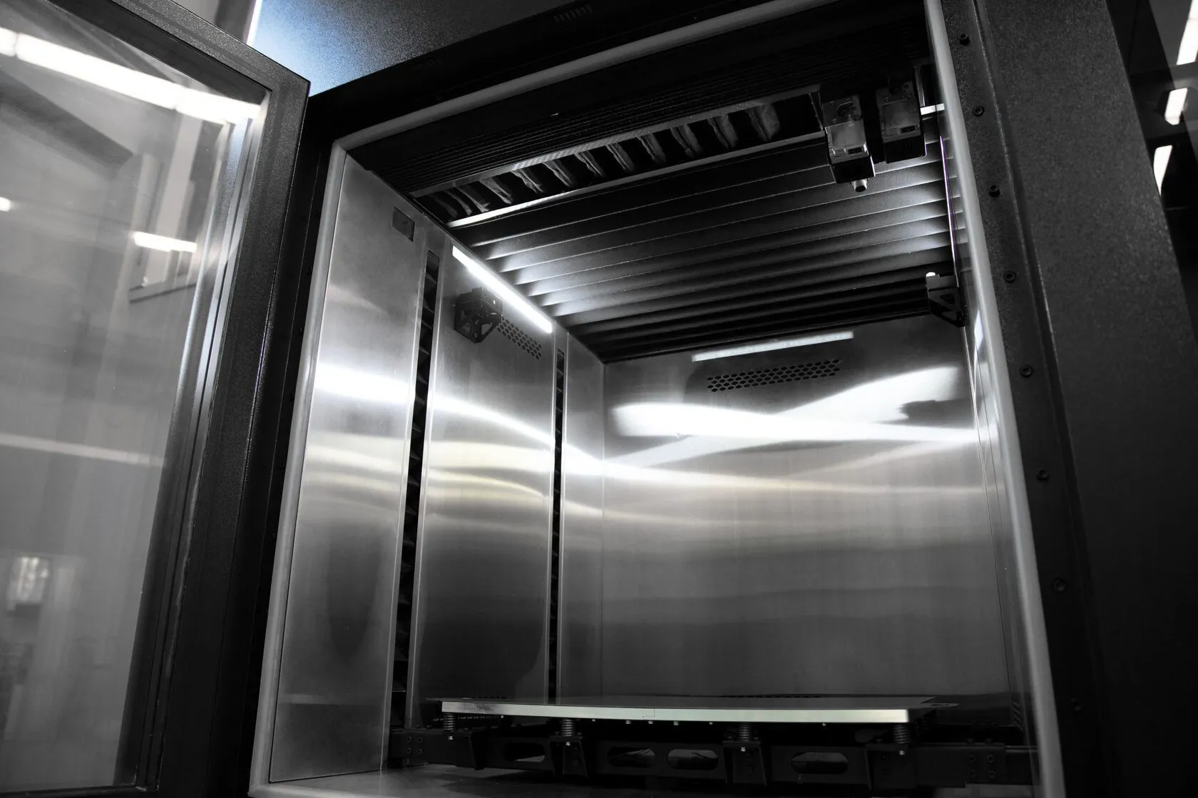 В герметичной камере находится область построения с размерами 600х600х600 мм, где поддерживается стабильная температура. Благодаря принудительной конвекции и равномерному прогреву, возможно создание крупногабаритных деталей с высокой адгезией между слоями. В процессе печати детали сохраняют свою целостность и форму.