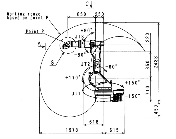 ✽2: Запястье 3R (Roll Roll Roll) в 6-осевом роботе это расстояние от центра JT1 до точки пересечения JT4 и JT5.