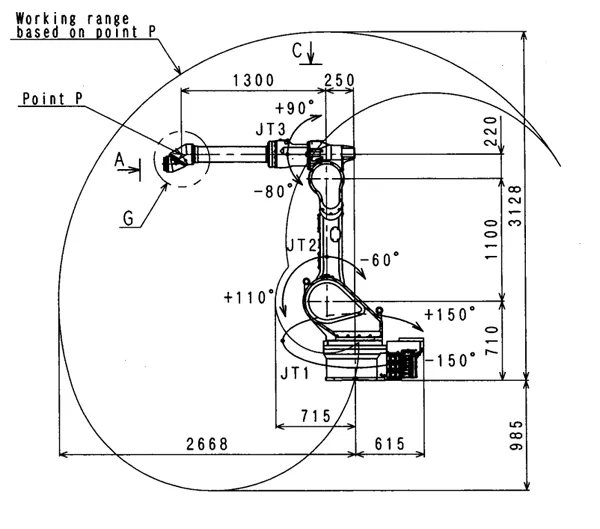 ✽2: Запястье 3R (Roll Roll Roll) 6-ти осевого робота - это расстояние между центром JT1 и точкой пересечения JT4 и JT5.