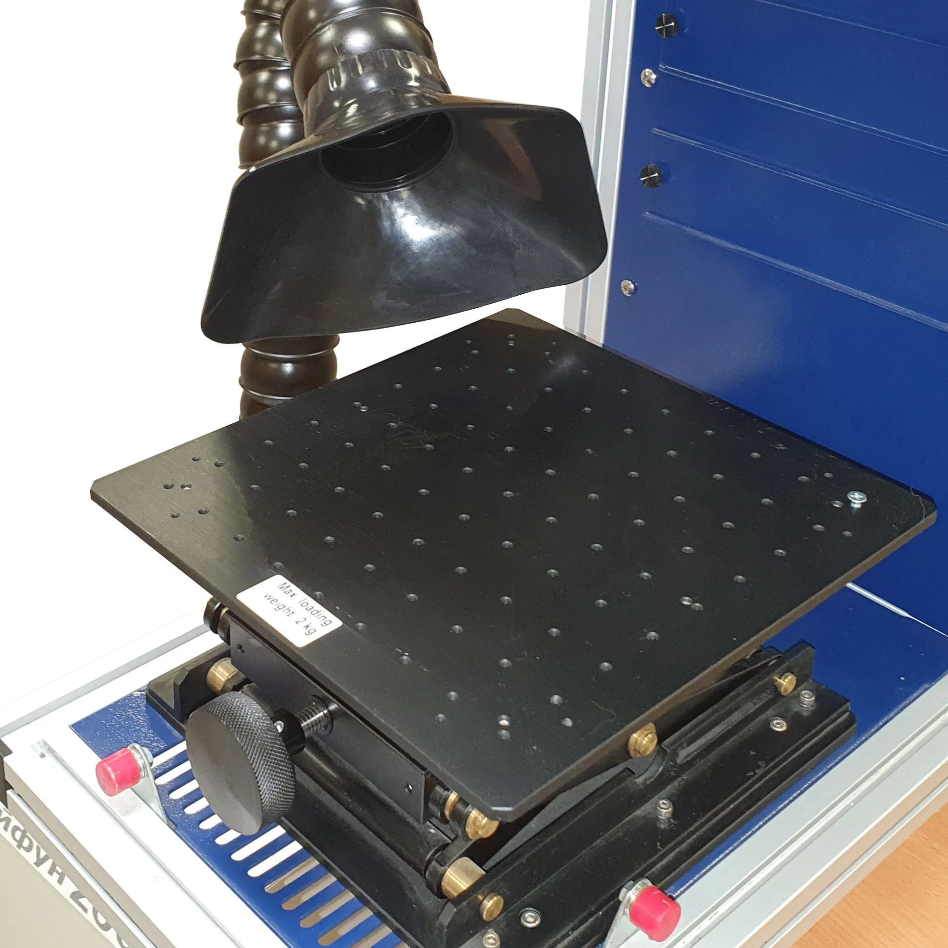 - Аппарат устанавливается на ровную поверхность в непосредственной близости от лазерного оборудования либо паяльной установки. Раструб размещается вблизи от рабочей зоны. Устройство включается и регулятором оборотов настраивается мощность воздушных потоков, которые находятся с фронтальной стороны вытяжки;