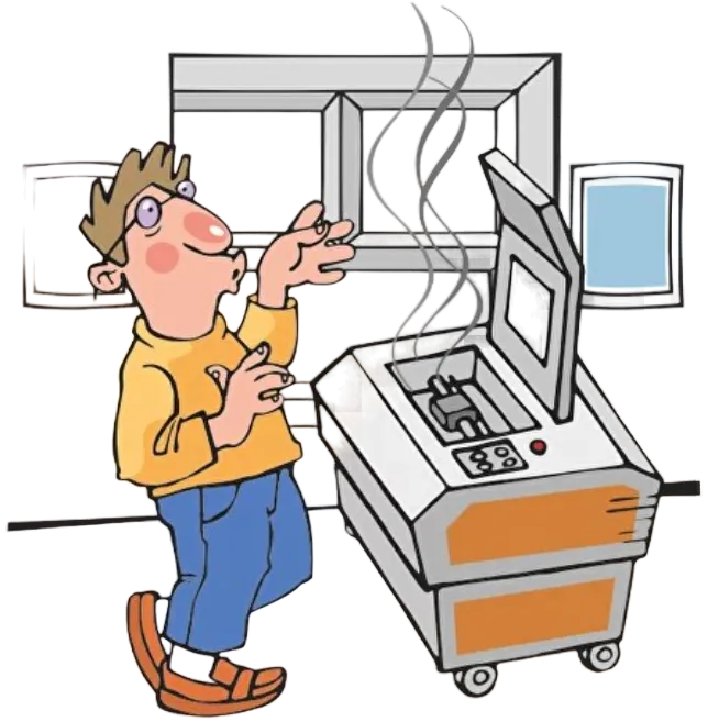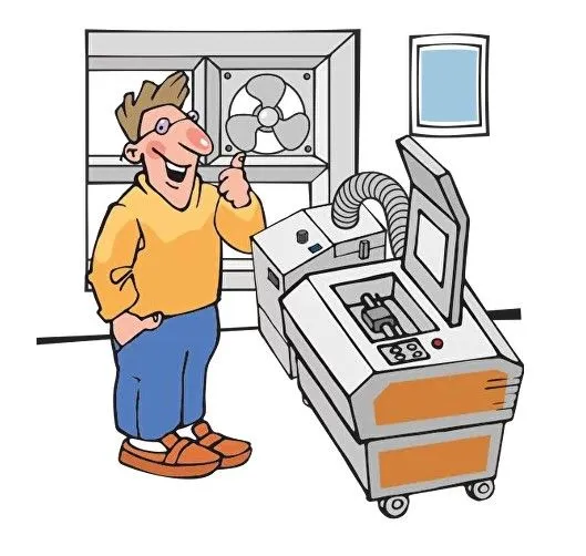 Внутренняя поверхность оборудования и обрабатываемый материал загрязняются испаренными частицами материала, которые не были удалены из рабочей области лазерного станка. Это приводит к образованию копоти, замасленности и других загрязнений. Порча материала, сбои в работе или поломка оборудования могут быть результатом этого. Фокусирующая линза или зеркало могут покрыться жировой копотью, пылью и смолами, что приводит к отражению или преломлению луча, снижению его мощности и, если их редко чистить, перегреву и разрушению оптики.
